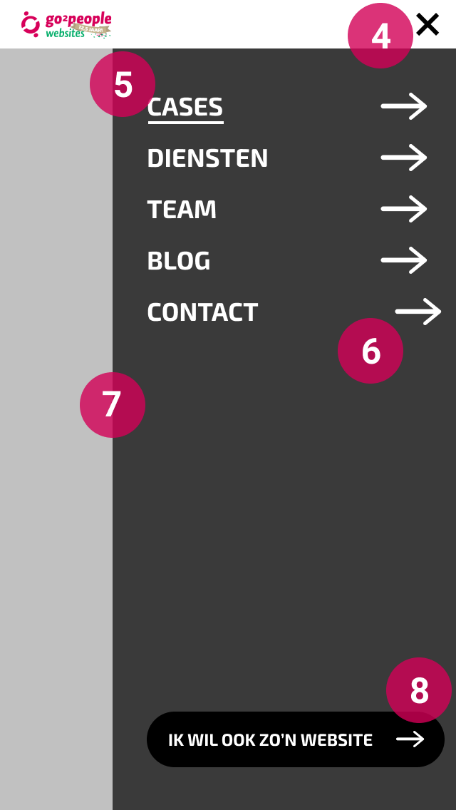 Voor de designers die dit overnemen of aanpassen, let op de groottes van alles! Bij meer dan 20 menu items is dit menu niet geschikt. Houd er rekening mee dat dit ook een menu is met een verborgen CTA.